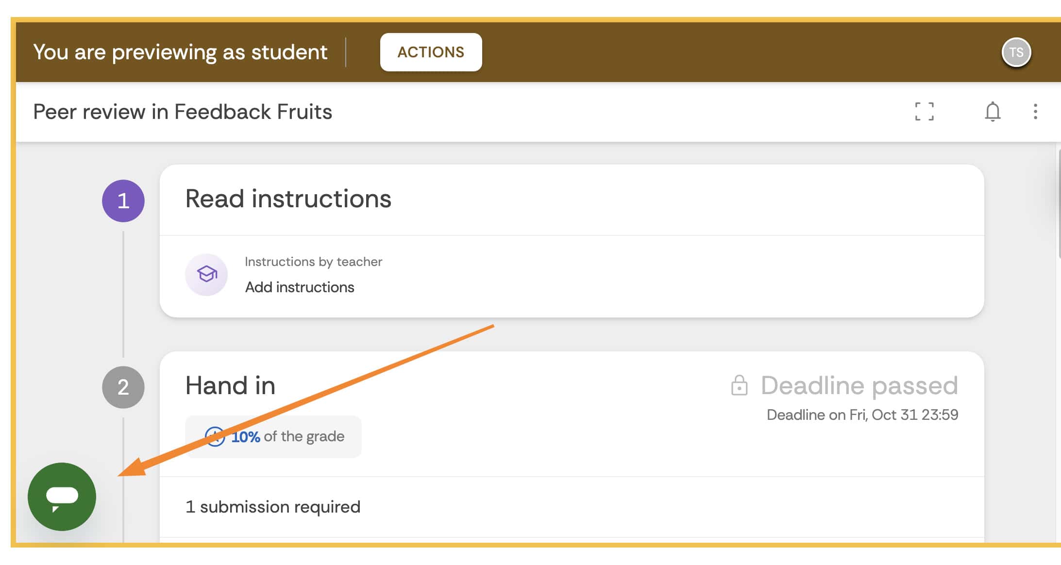 The chat functionality (green icon) is available on the bottom left of every FeedbackFruits assignment in Canvas.
